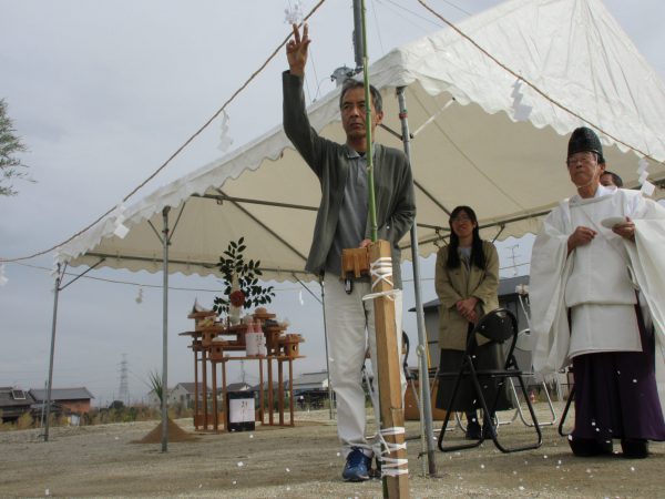 最近では地鎮祭を行わず建築工事を始める事も多い中、今日は葛城市に11月5日着工現場K様邸の地鎮祭を行いました。地鎮祭とは土地の神様に酒、米、塩、山の幸、海の幸などのお供えをし工事の安全と家族の健康、家の繁栄を祈念しこの地に新居を建てることのお許しを頂く昔から行われてきた建築の神事です。